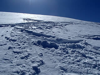 もう一度北面側斜面の様子。雪が着いているところとクラストバーンがまだら模様の感じです。
