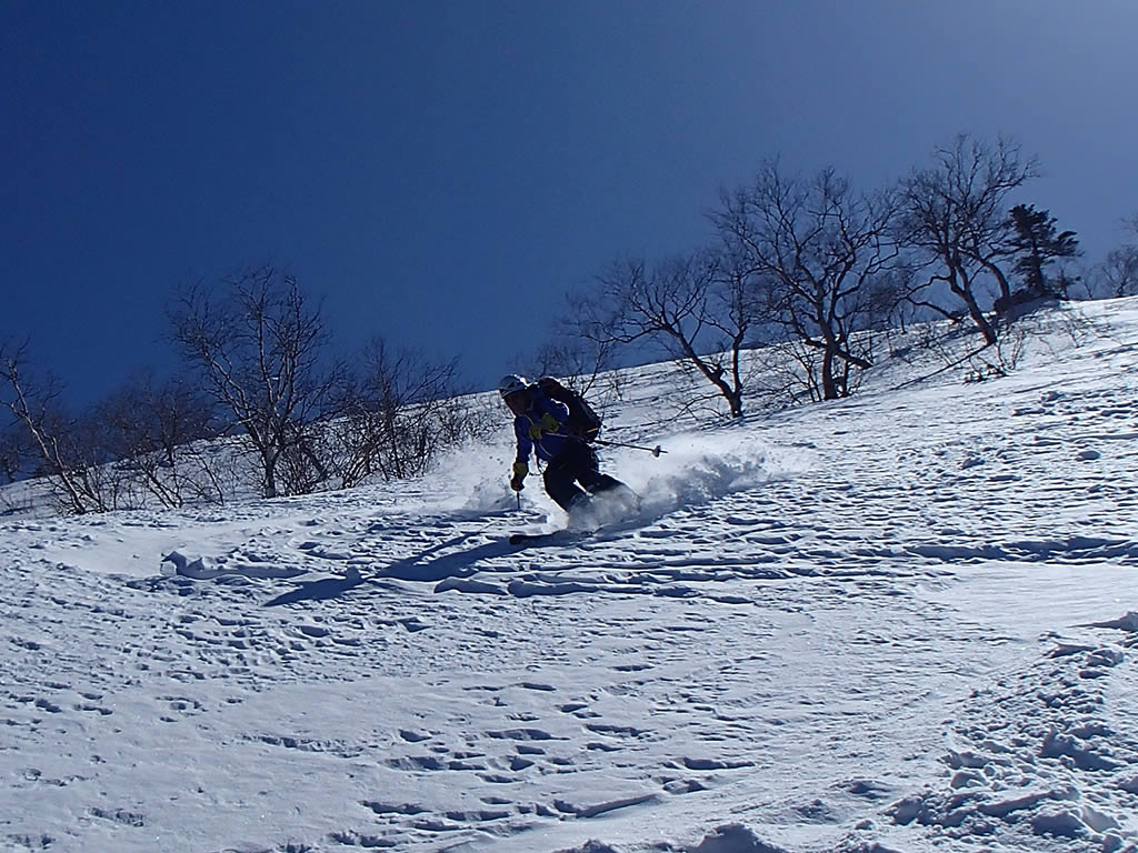 斜度が緩むと日当たりが良くなったせいか、やわらかい湿雪になり、それはそれで滑りやすかったです。