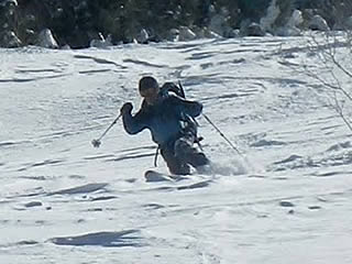 登山道に戻り、重い雪に四苦八苦しながら滑り降りていきます。