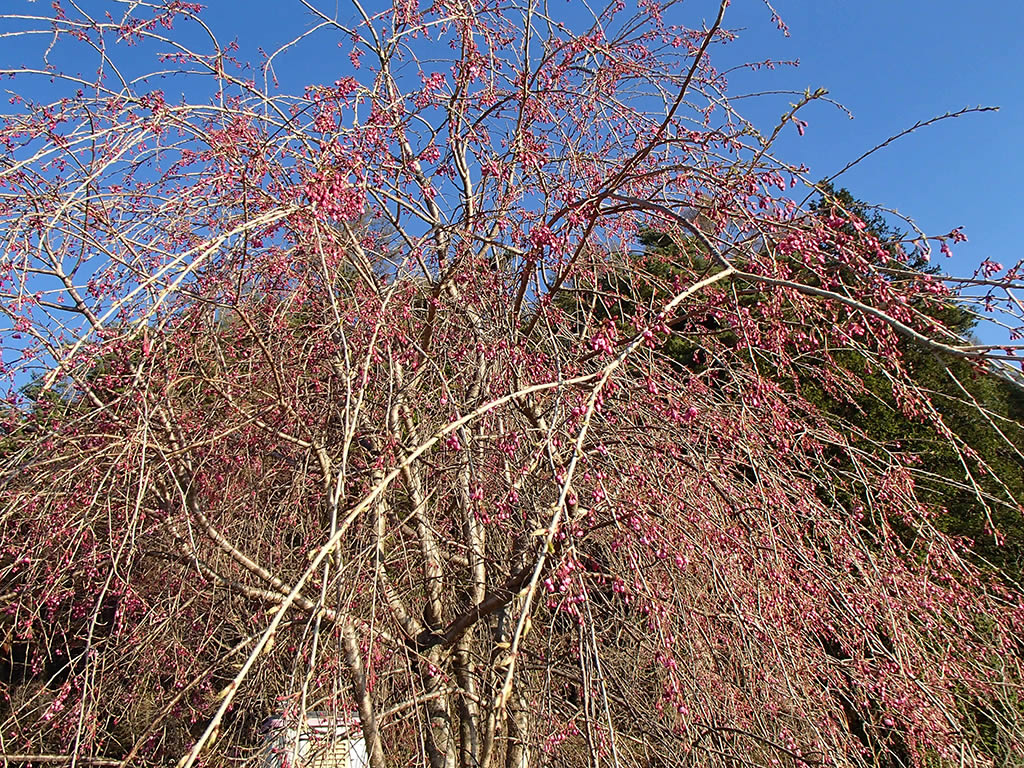駐車場脇のしだれ桜もぎりぎり咲き始め。