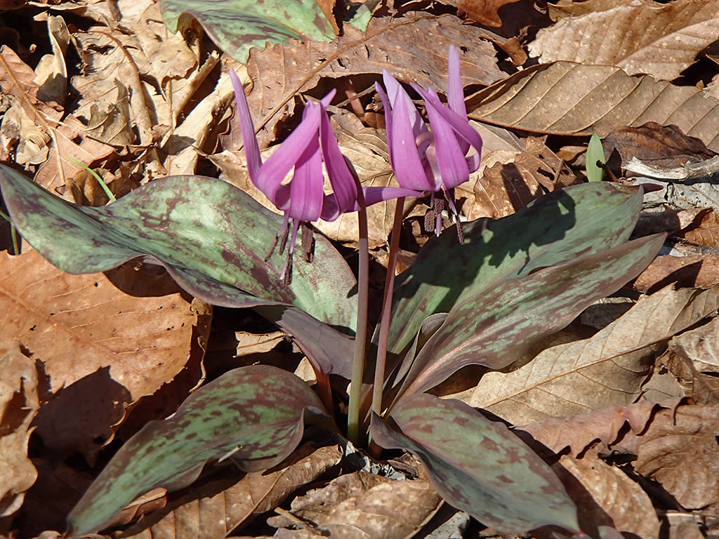 カタクリ群生地の女坂を下っていきますが、咲いていたのは数株ほどで、見頃は来週以降という感じです。ほとんどはまだ葉っぱだけ。