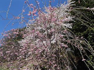 ここからは登山口近くで見かけた桜です。この桜は遠目ではもう散りかけかと思って近づくと....。