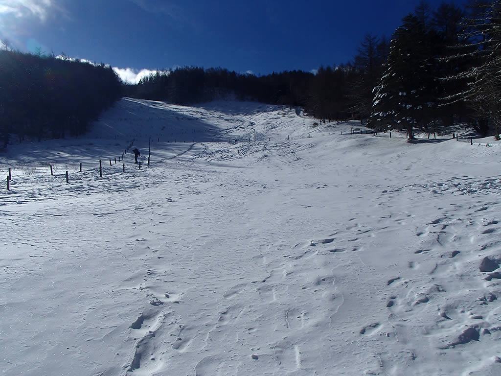 登山道をスキーで滑り降りるのは無理なので、下りは板を担いで歩いて下りました(^^;。そして再び御所平お花畑の斜面上部へ。