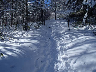 いつも通り登山道には進まずに林道を板を抱えて少し歩きます。坂を登り切ったところからスキーで滑って行きます。