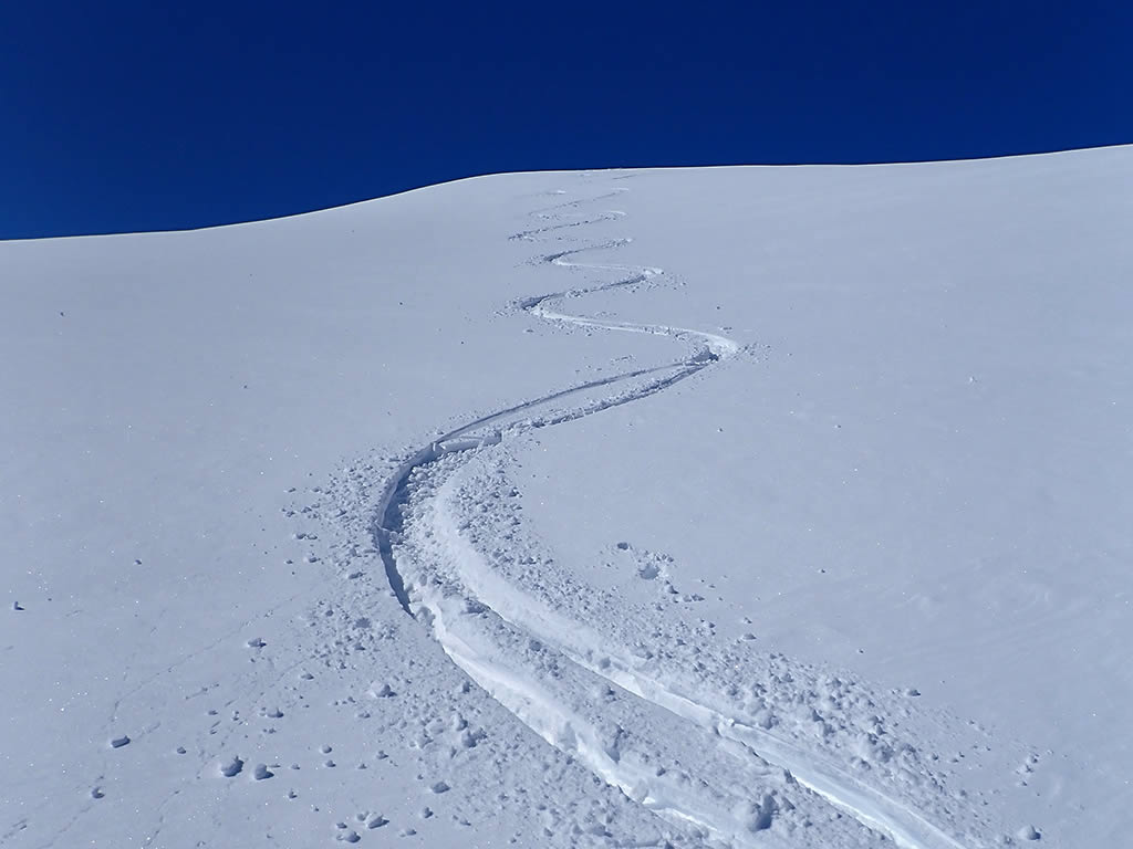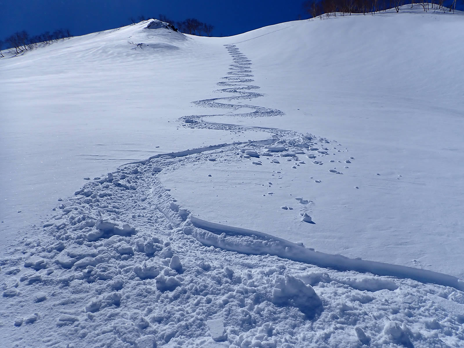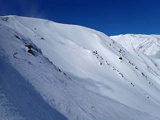 稜線はほぼカリカリまたはハードパックでしたが、少し下ると柔らかい新雪がたっぷりと吹き溜まっていて、気持ち良く滑ることが出来ました。