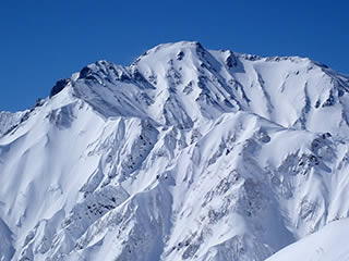 自宅を5時に出発し、八方尾根スキー場に向かいます。ただ八方尾根はガスがかかっていたので、予定を変更して栂池に向かいます。その途中で見えてきた白馬乗鞍岳。