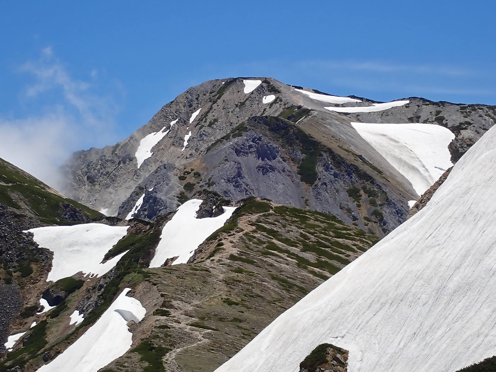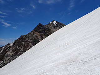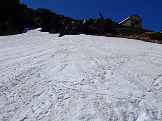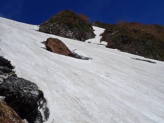 雪渓上部をズーム。急斜面は夏道がかなりでていますが、その上しばらくは急斜面をよじ登る必要があります。