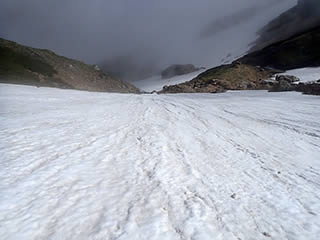 あちゃー、ぎりぎりだめ。下の雪渓まで右側の地面の部分を歩きました。