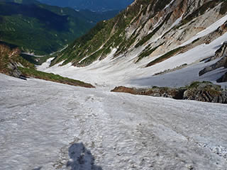 小雪渓は所々雪がつながっていません。帰りは3個所で歩きました。