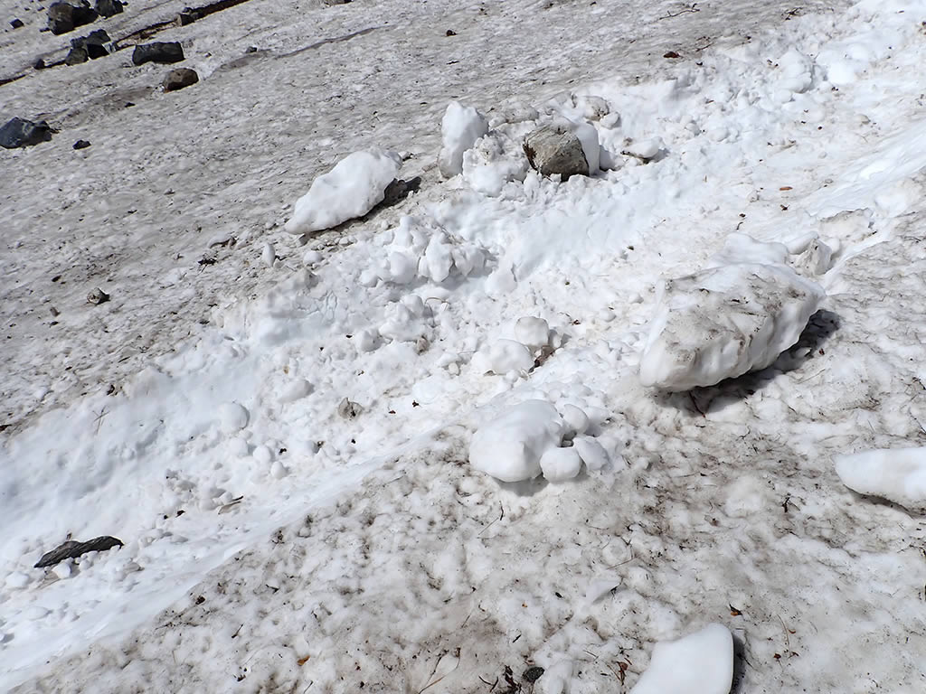 後で滑る斜面。岩の周りの空洞や亀裂に要注意です。