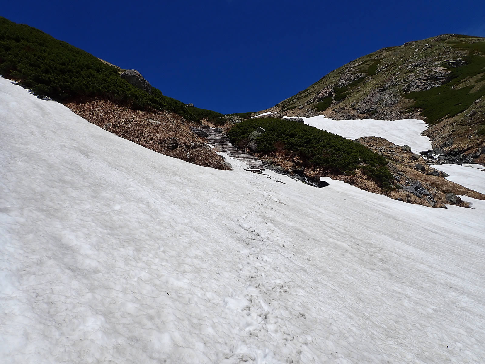 一番上の雪渓。私は雪渓を直登しましたが、左に行けば夏道がほぼでています。