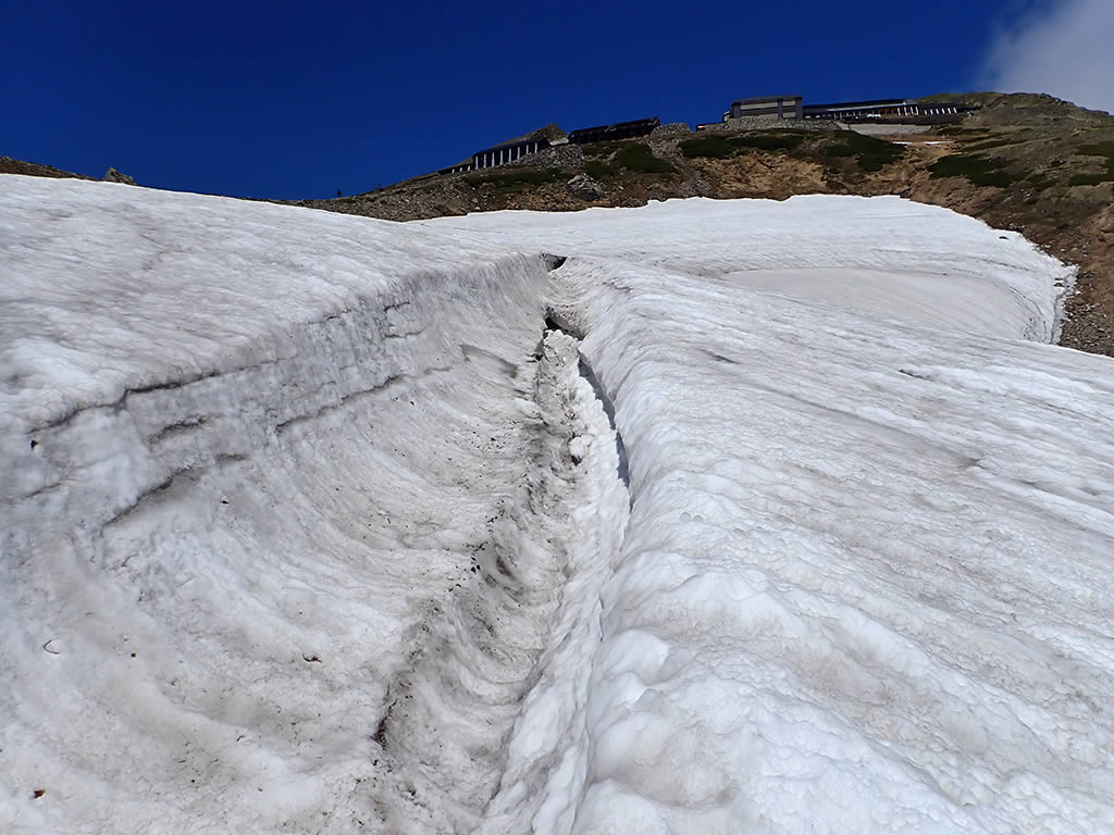 ただし雪渓下部の中央部はかなり溶けてきていますので、近寄らないように注意。