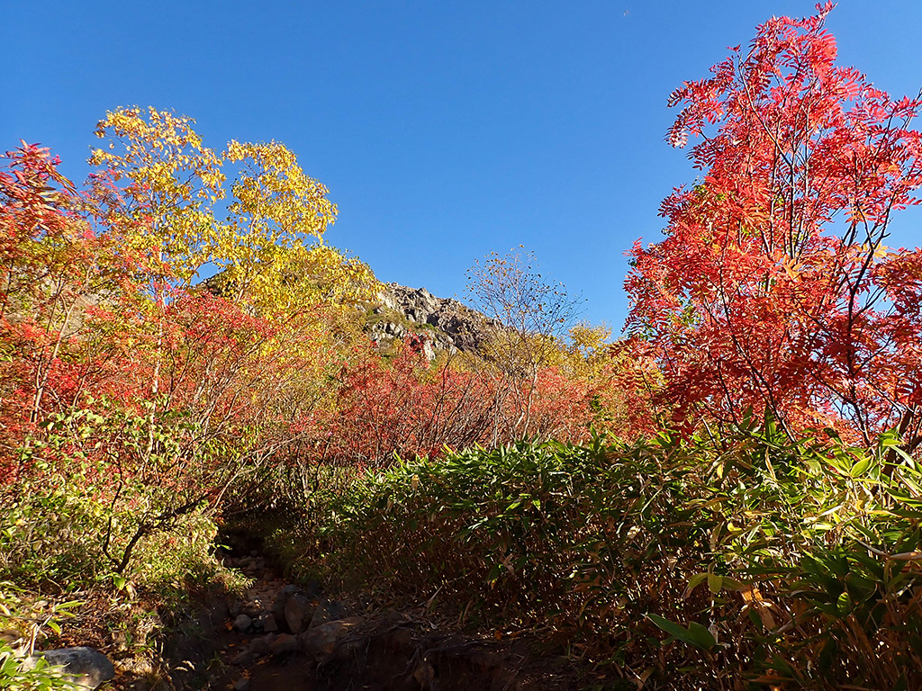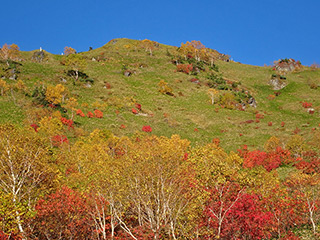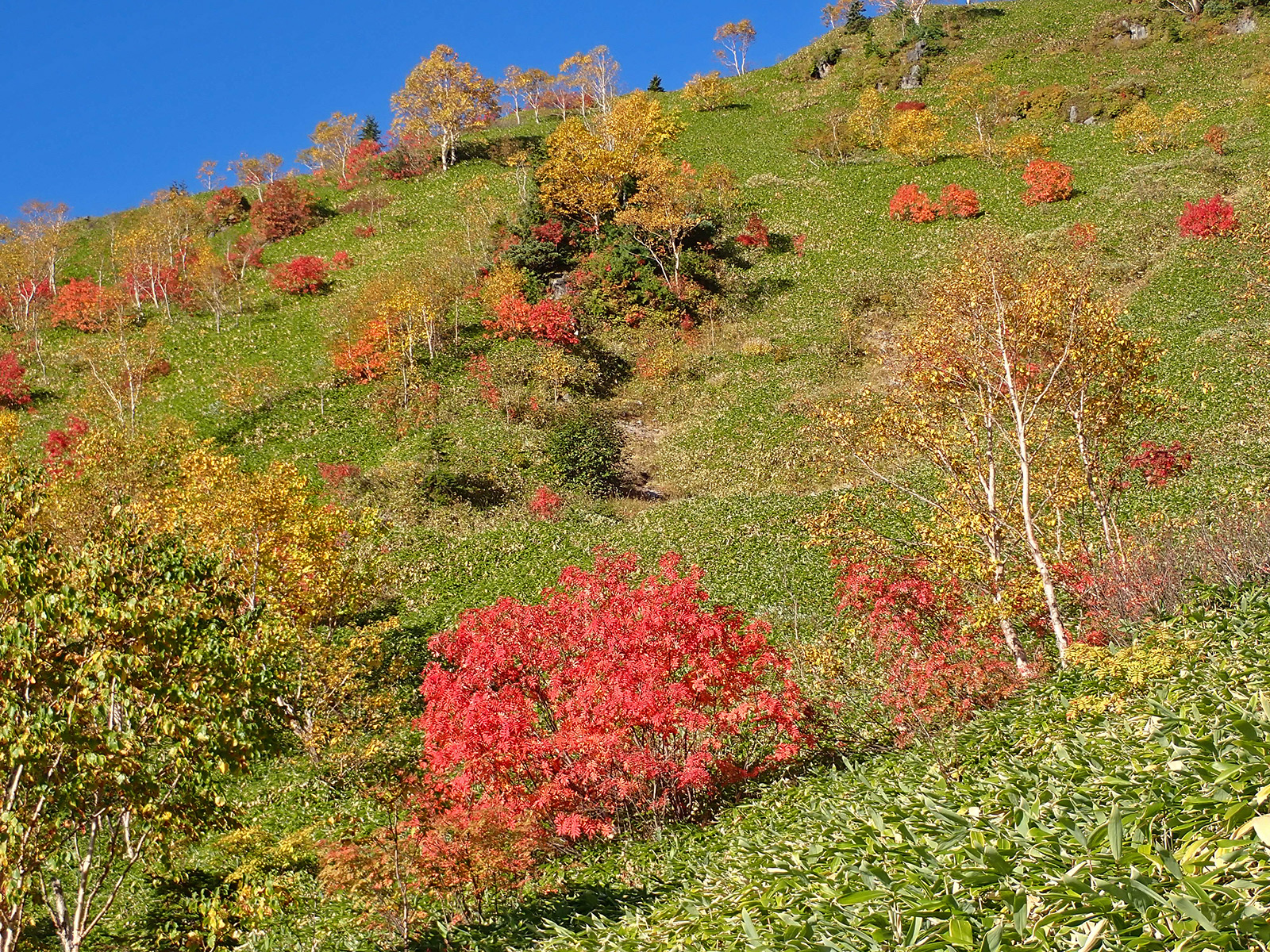 いつも広場の紅葉がピークの時に来ているので、この辺りは終わりかけでしたが、今回はこの上部斜面がほぼ全て見頃です。