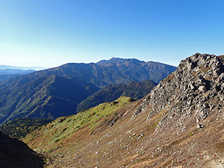 甲斐駒〜塩見岳、鳳凰山の辺りに富士山の山頂も少し見えています。