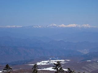 槍穂高、常念岳。手前に三峰山。三峰山もだいぶ雪が溶けましたが、滑れる程度の残雪はありそう。きっと快適ざらめ。