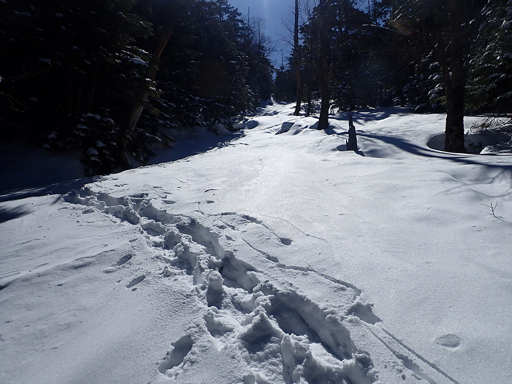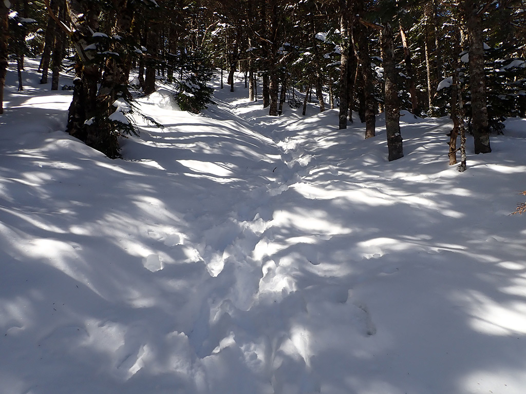 登るにつれて踏み跡が深くなっていきます。ただ雪もさらさらでなくもっさりに。