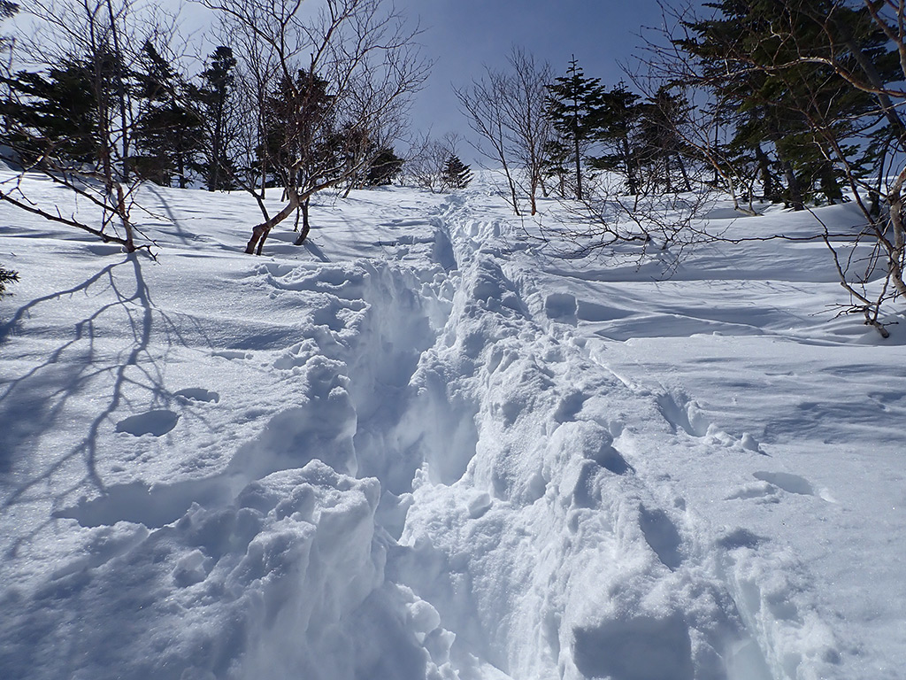 この辺りは登山道が広く、帰りには20cmほどのふかふかパウダーを楽しむことが出来ました。