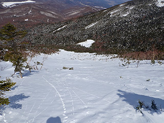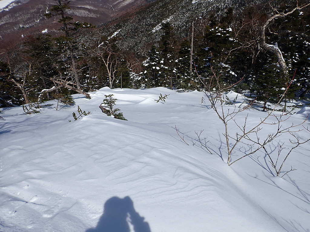この先は新雪が斜面に付いています。なんとか滑れそう。
