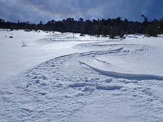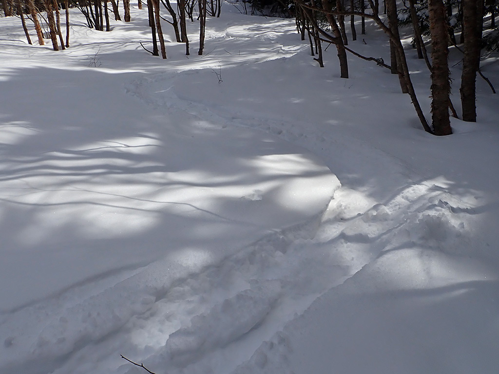 白樺高原国際スキー場のゲレンデトップで新雪は10cmほど、将軍平で20cmほど、山頂手前の樹林帯では30〜50cmほども新雪が吹き溜まっていて期待は高まりましたが、樹林帯を出るとその先は一面がりがりのクラストバーンに(^^;。滑っても怖いだけなので、山頂には行かずに北面側にトラバースして新雪が着いている斜面を探します。いつもの疎林帯入口の少し上から新雪が付いていましたので、そこからスキーで滑りましたが、疎林帯には新雪が20cmほど積もっていました。北面オープンバーンですが、風の影響か新雪はせいぜい10cmほどしかなく、その下はカチカチバーンなので滑落しないように慎重に滑り降りました。