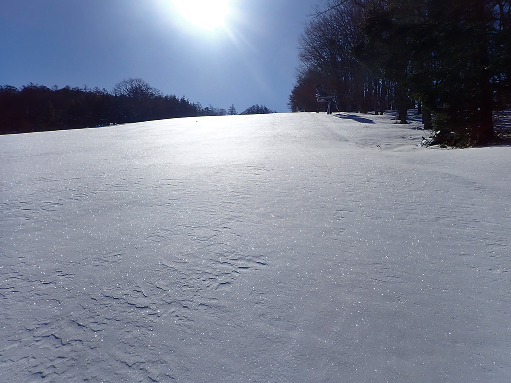 ゲレンデ下部は良さそうに見えますが、朝は軽くもなか。帰りには日差しで緩んで快適に滑ることが出来ました。