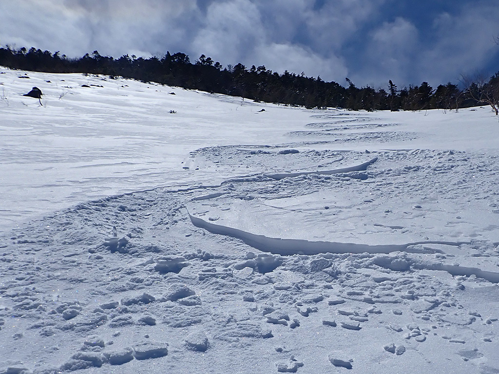 新雪の厚さがうっすらから20cmほどと場所によって極端に変わり、新雪の下はカチカチのアイスバーンですので、滑落しないように慎重に滑り降ります。