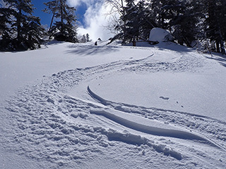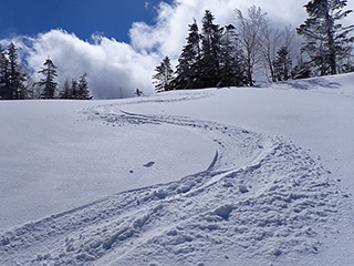 登ってきたルートに沿って滑り降りて行きますが、クラスト層に板が取られ気味でなかなかにテクニカル。なだらかになると滑りやすくなりました。