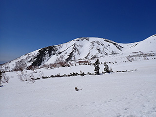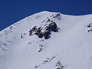剣ヶ峰をズーム。剣ヶ峰直下、蚕玉岳の斜面は東向きなので、まだあまり緩んでいなさそう。今日の第一候補は剣ヶ峰でしたが、カチカチだと怖いので、雪が緩みやすい摩利支天岳側を滑ることにしました。