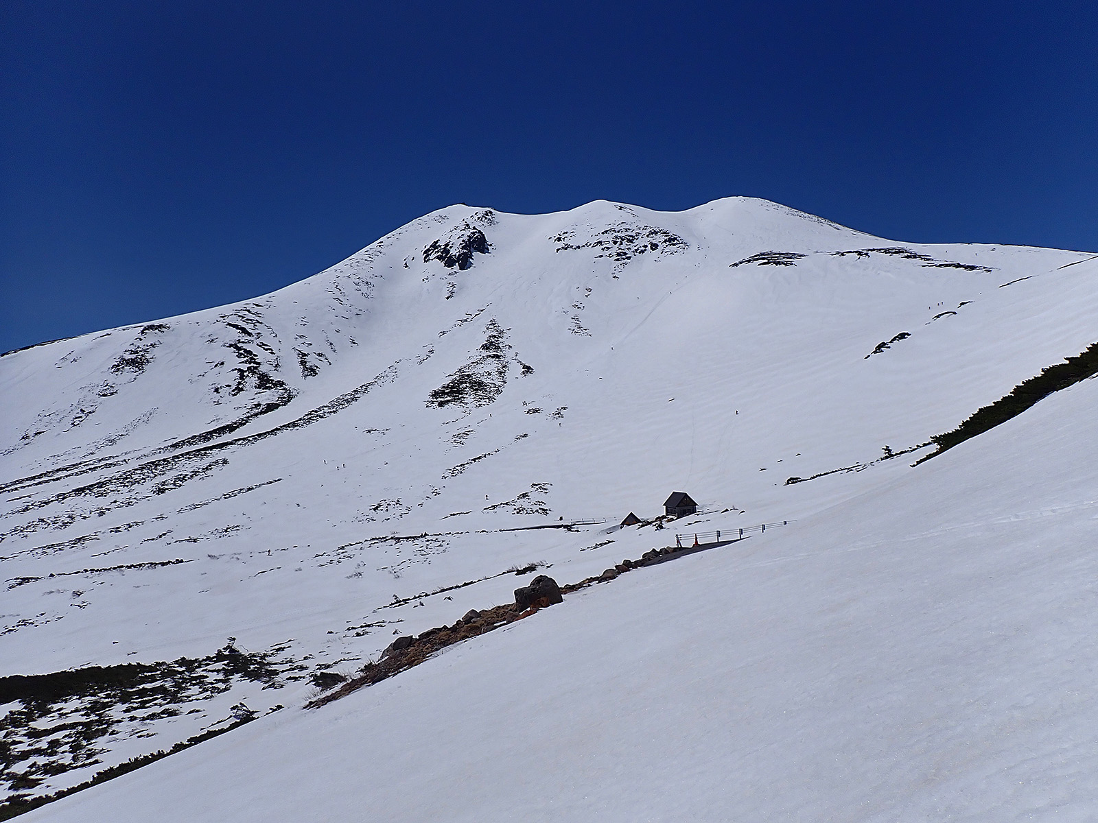 朝日岳の斜面。今日は肩の小屋経由で無く、直接朝日岳に向かう人が多かったです。