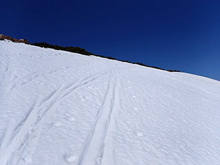 間もなく稜線。この辺りは斜面の向きのせいか、まだかなり堅めでした。