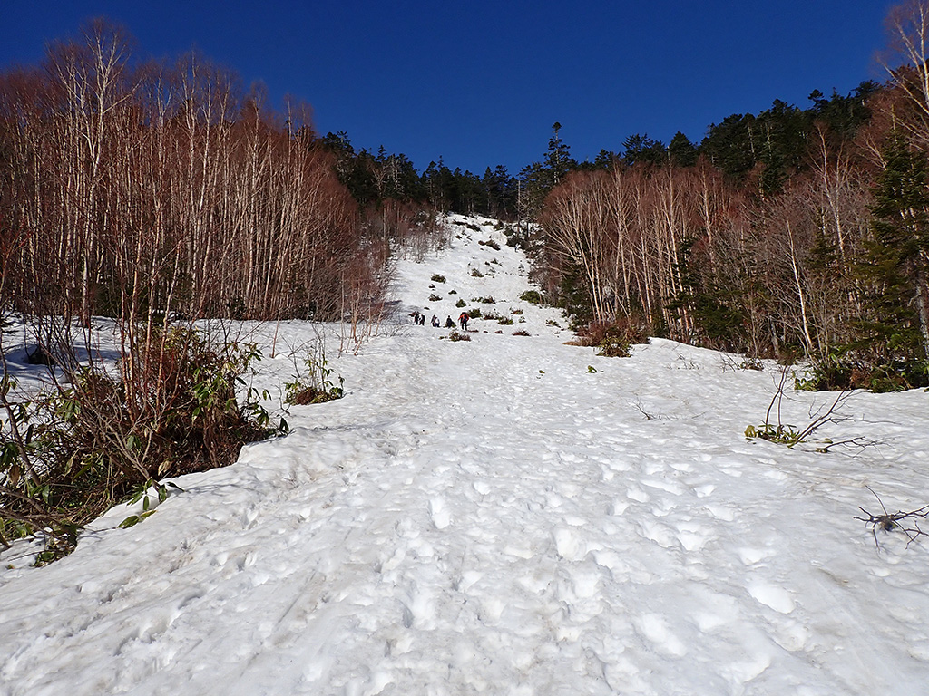 ツアーコースもゲレンデに近い方は笹で通行困難ですが、この辺りから残雪が増えます。