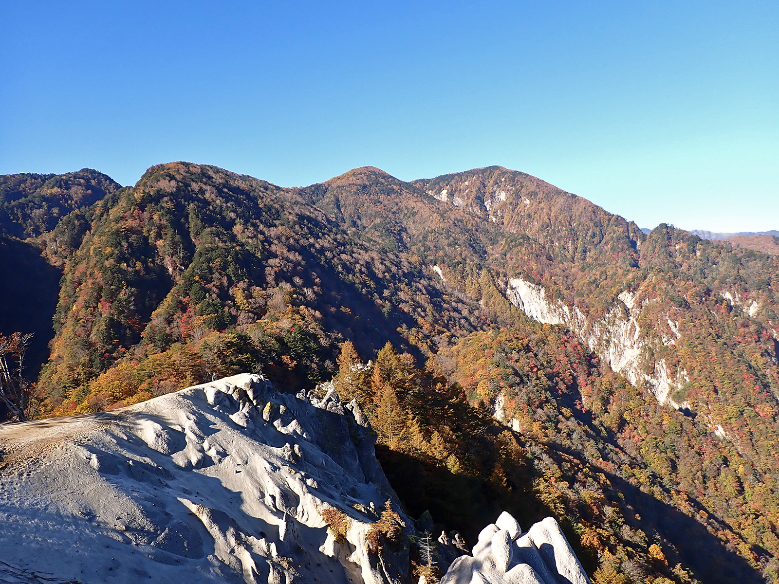 紅葉ですが、矢立石はほぼ緑、矢立石と山頂の中間辺りから色付き始め、山頂ではほぼ見頃という感じで、フレッシュな紅葉を楽しむことが出来ました。また雲一つ無い快晴に恵まれ、八ヶ岳、甲斐駒、鳳凰山、奥秩父、富士山など大展望も楽しむことが出来ました。