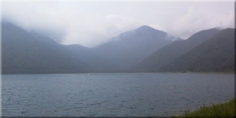 この写真は本栖湖のファンボードゲレンデです。夏のよく晴れた日には、ちょうど正面に見える山のあたりから湖面に向けて強風が吹き下ろしてきます。スラローマーの天国です。