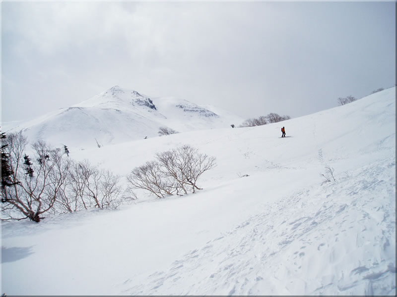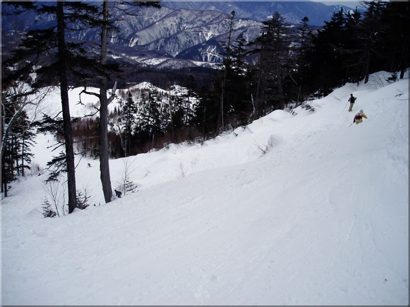 この斜面を気持ちよく滑るためには滑り専用のテレマークか、あるいはヒールのロック出来る山スキー、あるいはスノーボードが最適だなあとつくづく感じたのでした。(今回一緒に行ったボーダーのS君、気持ちよさそうに滑っていったなあ)