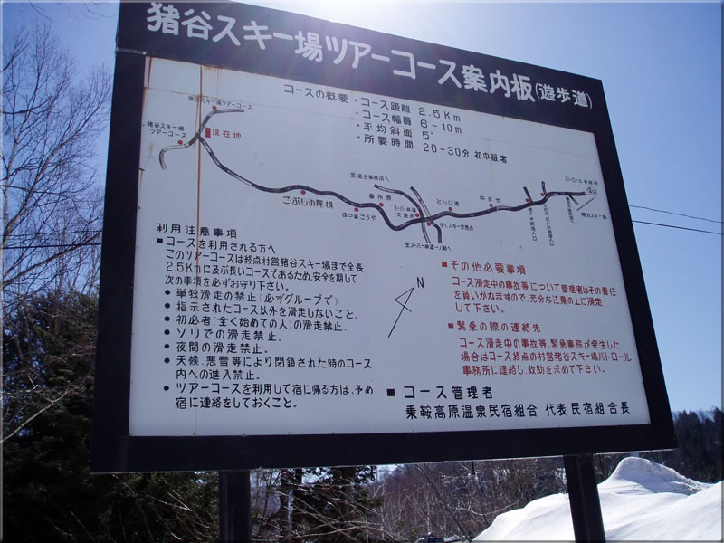 ここから再び猪谷スキー場へのツアーコースを進んでいきます。多くの人が通っているようで沢山のスキーやスノーシューの跡があります。