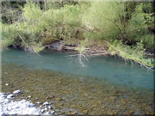 今回下った中で一番大きな瀬は次の瀬でした。名前が付いているのか分かりませんが、左カーブで川がいくつにも分流し、本流は一番右です。分流の方は水量がないので明らかにカナディアンでは無理だろうということで本流の方に行ってみたのですが、本流は途中に大きな岩がごろごろしているコースとなってしまい、次の写真の場所まで来てこの瀬を下るのは諦めました。