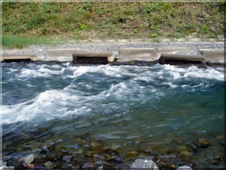 川はその後いったん浅くなり、そして瀬の最後は本流が消波ブロックにもろにぶつかっています。