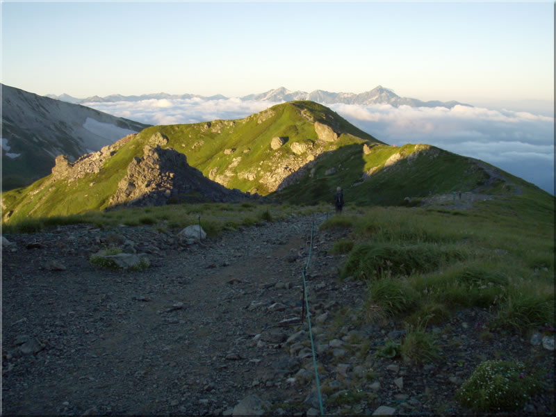 さて次の日の朝、5時に起きたら予想通り雲一つ無い青空が広がっていました。早速寝ている子供達を残して、デジカメを持って白馬岳山頂に向かいます。