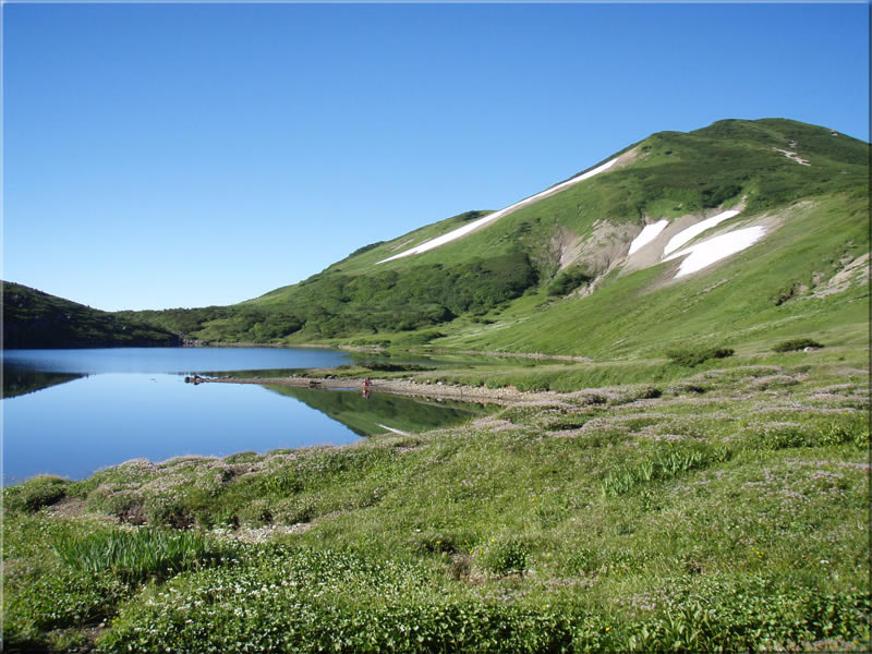 振り返ると真っ青な空を映した白馬大池がきれいに見えています。