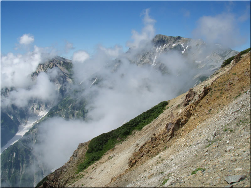 残念ながらこの頃になると周りはすっかりガスで覆われて、ほとんど展望はありませんでした。まあここからの展望は明日の朝に期待することにして、今日のお昼を予定している白馬山荘に向けて下っていきます。