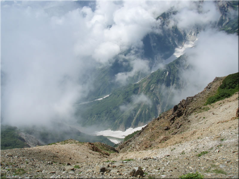 しばらくすると下の方に大雪渓が見えてきます。