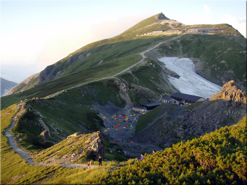 山頂からは10分ほどで白馬山荘に到着します。なお次の写真でもう一つ下に見えている小屋が、今日のキャンプ地である白馬岳頂上宿舎です。