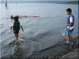 だいぶウインドは出ているものの、風が多少弱めでかっ飛んでいるウインドはそれほどいませんでした。しばらくは様子見ということで、その間子供達とシュノーケリングをしてみました。なお今回水中の撮影に使っているのは、オリンパスのデジカメμ770SWの単体使用です。