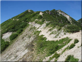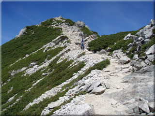 上の写真の右の上の方にちょこんと見えるケルンが丸山ケルンです。その手前に一ヶ所だけ雪渓を歩くところがありました。長い距離ではありません。