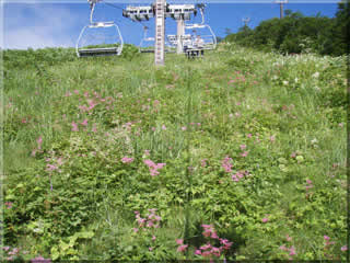 リフトですが、冬と違って低い位置に付け替えられていまして、場所によっては足が草に触れるくらいの高さとなっていました。リフトの下もきれいなお花畑になっていました。