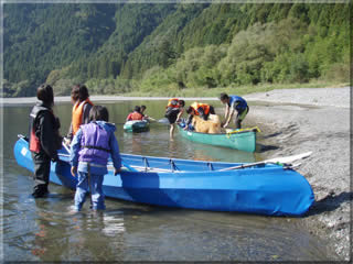 キャンプ設営やフォールディングカナディアンの準備をしていたら午後2時を過ぎてしまいましたので、今日は川を下らずにこのあたりで軽く初心者用の練習をしてみることにしてみます。(今回、カヌーに初めて乗る小学生が1人、高校生が2人、川を下るのは初めての高校生が1人いたため)