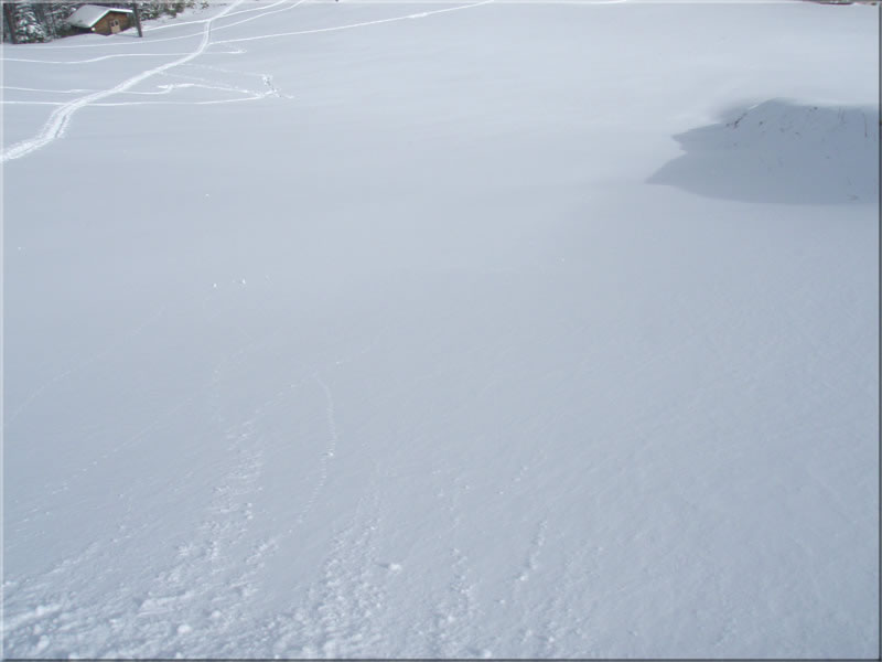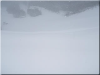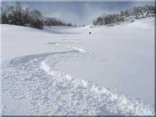 それにしてもふかふかのパウダーが3、40cmほど積もっています(^^)。これは滑ると気持ちよさそうと言うことで、ここより先に進む前にまずこのゲレンデを1回滑ることにしたのでした。そしてそれがあまりに気持ちよく、上に行ってもガスっている可能性が高いですし、結局今日はこの先には行かずに、このゲレンデにとどまって何回か歩いて登って滑ることにしました。