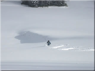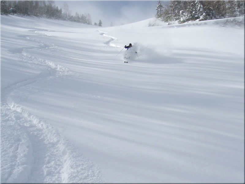 次の写真は友人の滑り。私と比べてより直線的な小さいターンで滑りますので、スピードが出て雪煙がものすごく上がっています。