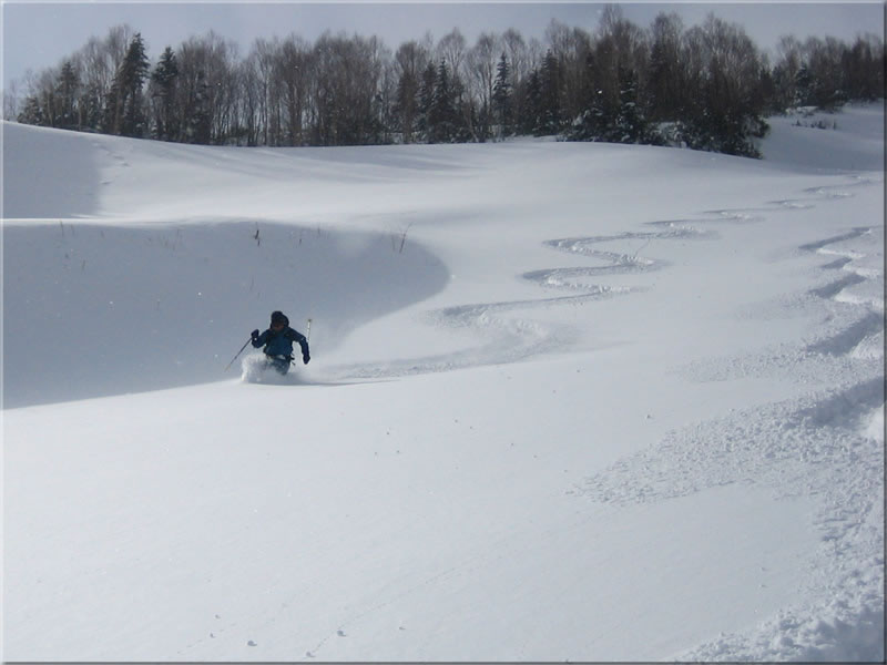今回は軽い、しかもほとんど荒らされていない新雪を思う存分滑ることが出来て大満足の1日でした(^^)。