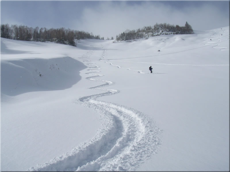 最初の斜面を振り返ってみます。私のシュプールは右側。友人のシュプールは左側。それにしても雪が軽く、テクニック関係なしにとても滑りやすい雪です。