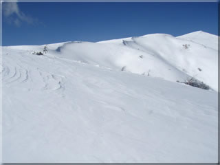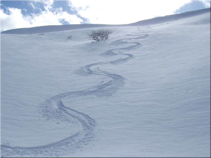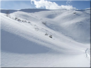 一番ドライブイン側の斜面。距離はそれほどありませんが、斜度もそこそこあり、何よりいかにもパウダーの吹きだまりという感じ斜面です。今回もここの滑りは最高でした。